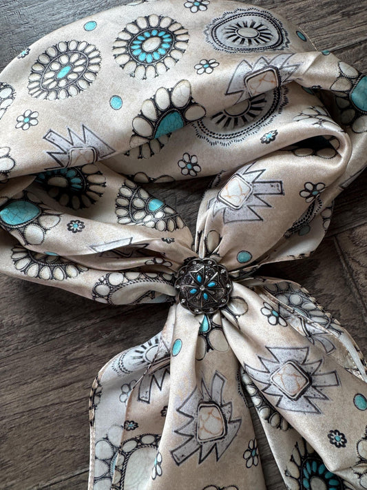 100% Silk Wild Rag Ivory Turquoise and White Buffalo Concho by Double B Wild Rags