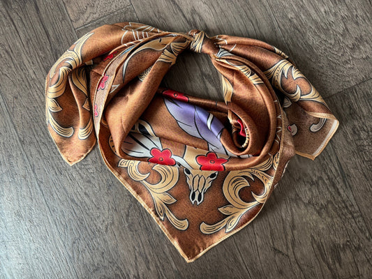 100% Silk Wild Rag Brown Boot inspired western skulls, feathers, and flowers by Double B Wild Rags