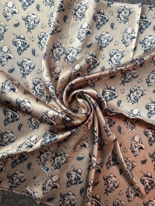 100% Silk Wild Rag “Cowboys Best Friend” by Double B Wild Rags Cowdog sketch’s on beige Corgi Frenchie Golden Retriever Jack Russel