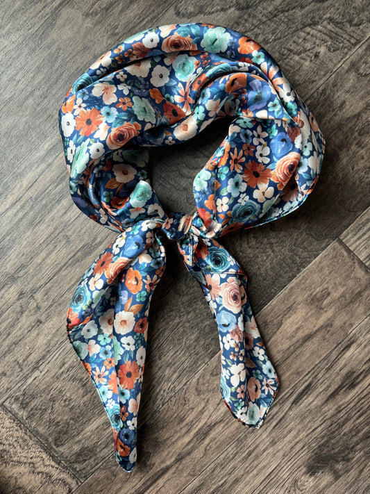 100% Silk Wild Rag Dainty Navy Orange and mint green floral by Double B Wild Rags