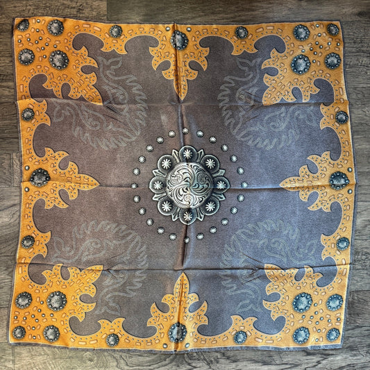 100% Silk Wild Rag Charcoal Brown suede leather and conchos with boot stitch accents by Double B Wild Rags