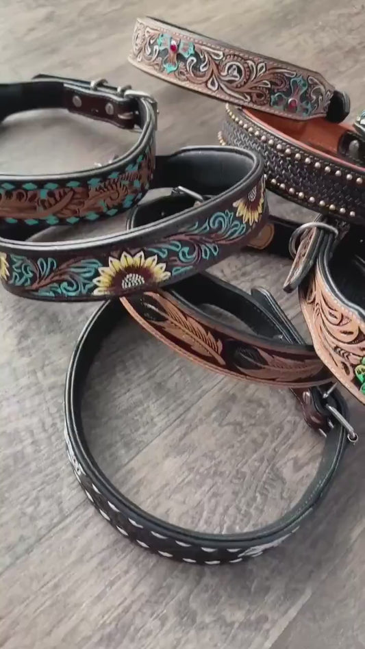 Western leather dog collar tooled or beaded details skull sunflower feather rhinestone by Double B Wild Rags