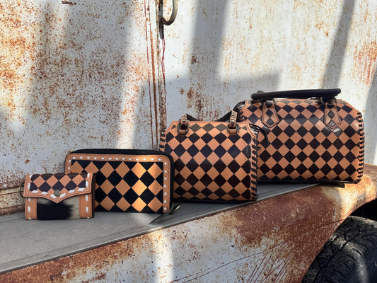 Caramel Espresso Checkered Speedy Western Genuine Leather Purse with optional wallet