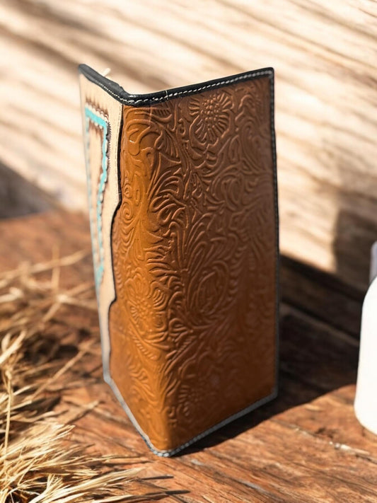 Western Cowboy Checkbook wallet tooled leather with painted turquoise by Double B Wild Rags