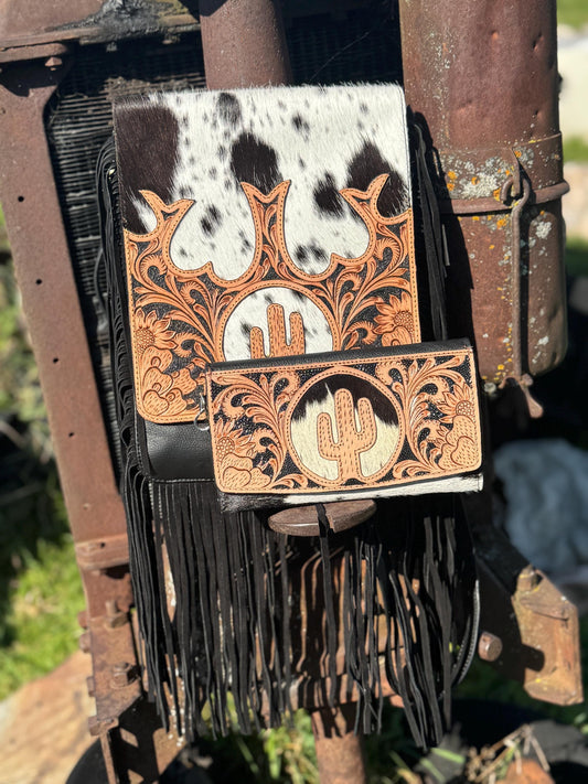 Genuine Western Cowhide Leather Purse and Wallet set with fringe and Cactus Tooling