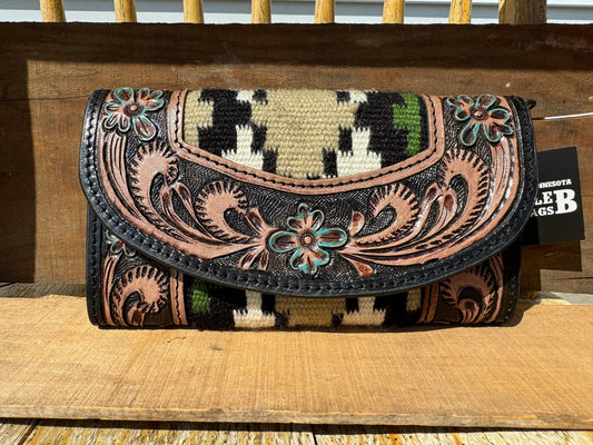 Western wallet with tooled floral leather and woven saddle blanket details by Double B Wild Rags